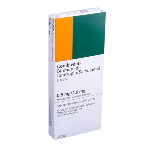 Combivent® es una solución para nebulización que combina dos broncodilatadores, bromuro de ipratropio y salbutamol, formulada especialmente para el tratamiento del broncoespasmo reversible asociado con enfermedades obstructivas de las vías aéreas, como la Enfermedad Pulmonar Obstructiva Crónica (EPOC). Su doble acción ayuda a relajar los músculos de las vías respiratorias para facilitar la respiración de manera rápida y sostenida.